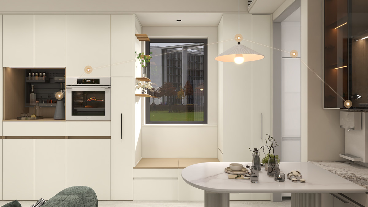 在海尔的适老化样板间中,我们看到了这一理念的生动实践。在智慧服务方面,家中植入了“智慧康养”主动守护系统。从能监测呼吸心跳的智能床,到燃气泄漏自动报警,科技无声守护每一天。厨房区域特别配备了烟灶联动功能,开火瞬间油烟机自动启动,防干烧更安心。顶部的声光报警器、燃气感应器和烟雾感应器,共同组成了安全的保护盾,实时监测厨房用火用气的安全。
