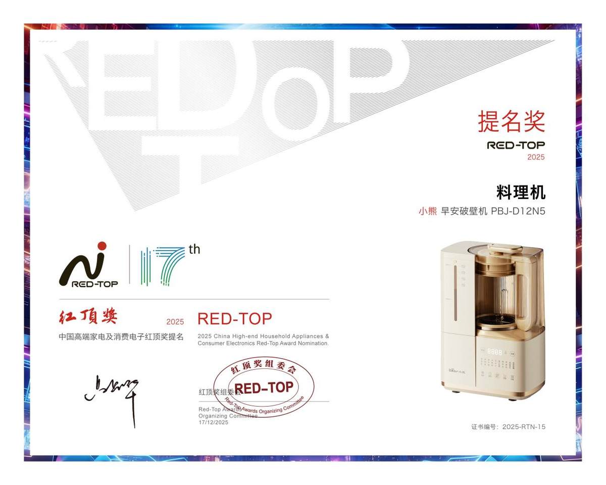 12月17日,第17届中国高端家电趋势发布暨红顶奖颁奖盛典在北京举办,小熊电器早安破壁机成功入围。这份荣誉不仅是对其产品的认可,更是对小熊电器坚守品质、深耕创新,以好产品打造轻松愉悦的品质生活的肯定。