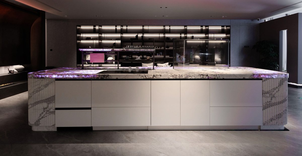 真正的美好生活不只是功能叠加,而是美学与科技的融通共生。过去,家装、家电、智能、软装是四条互不相交的平行线,消费者不得不分头奔走,自己费力拼凑出一个家。而在三翼鸟与博洛尼联手打造的智慧场景中,不仅多品类家电与橱柜全面嵌入,实现面面齐平、线线相同,还做到了色彩与材质的统一。比如店内,致境MAX厨房采用全套卡萨帝嵌入厨电,以及博洛尼七系未来之境橱柜,天然的爱荷华胡桃木搭配曜石黑岩板,结合空间黄金比例,橱柜与冰箱的面板同质同源,实现厨房空间功能与美学的融合统一。