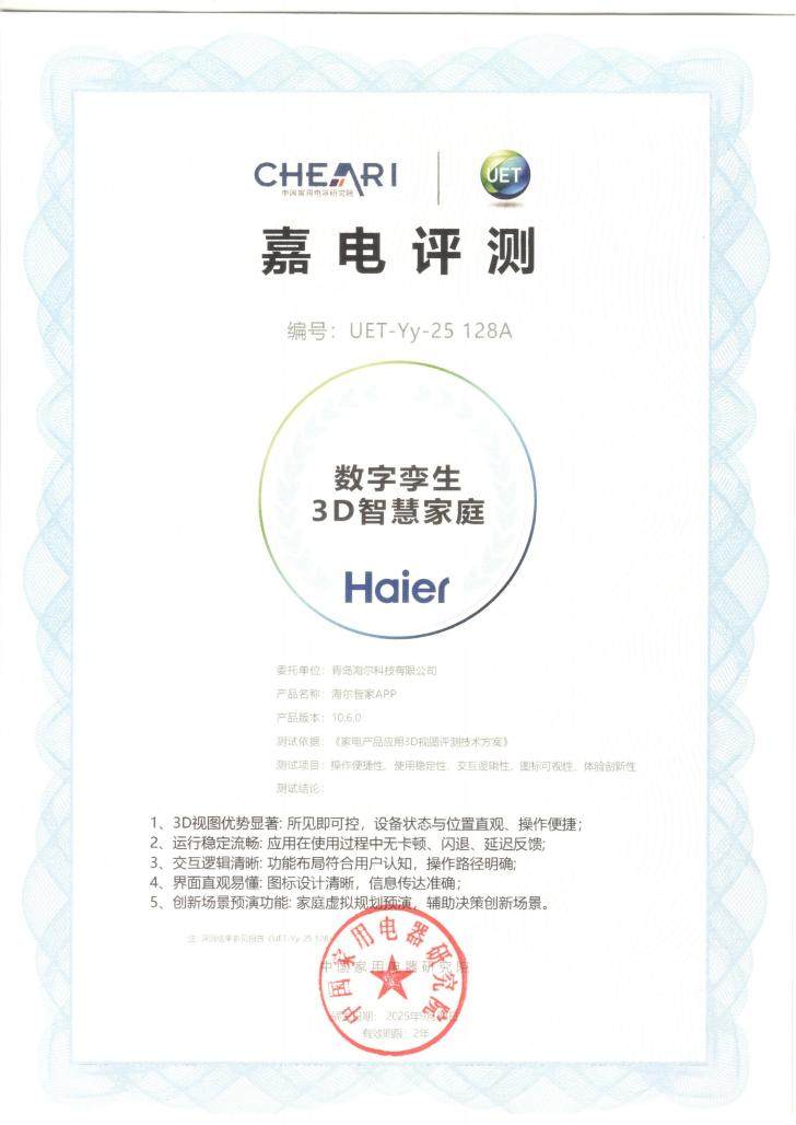 (原标题:家电院评测:海尔智家APP获评“数字孪生3D智慧家庭”)