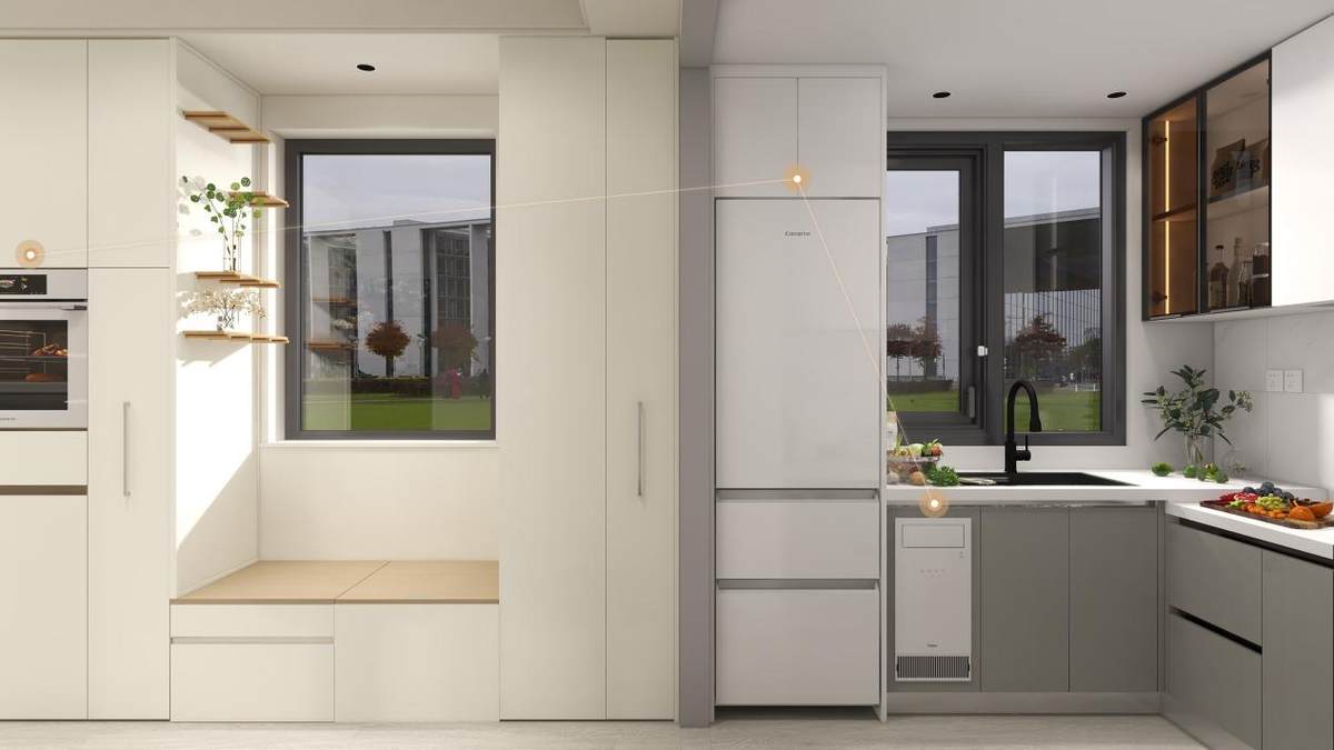 从进门开始,无需动口或动手,归家模式便主动开启,灯光温柔亮起,防止老人摸黑开灯,而准备离家时,按一下门口智能面板,便可一键关闭全屋灯光。在厨房做饭时,开火瞬间油烟机自动启动,再不用担心被油烟呛到,燃气灶防干烧也更安全,烹饪完挥挥手烟机便收回上方的柜子里,方便又不占地。