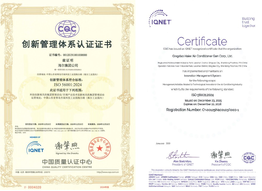 12月30日,中国质量认证中心(CQC)正式向海尔空调颁发基于国际标准《ISO 56001:2024》的创新管理体系认证证书,CQC所属的国际认证联盟(IQNET)也同步授予认证。这标志着海尔空调成为家电行业首个获得该体系国际、国内双认证的企业,其创新管理能力已达到国际领先水平。