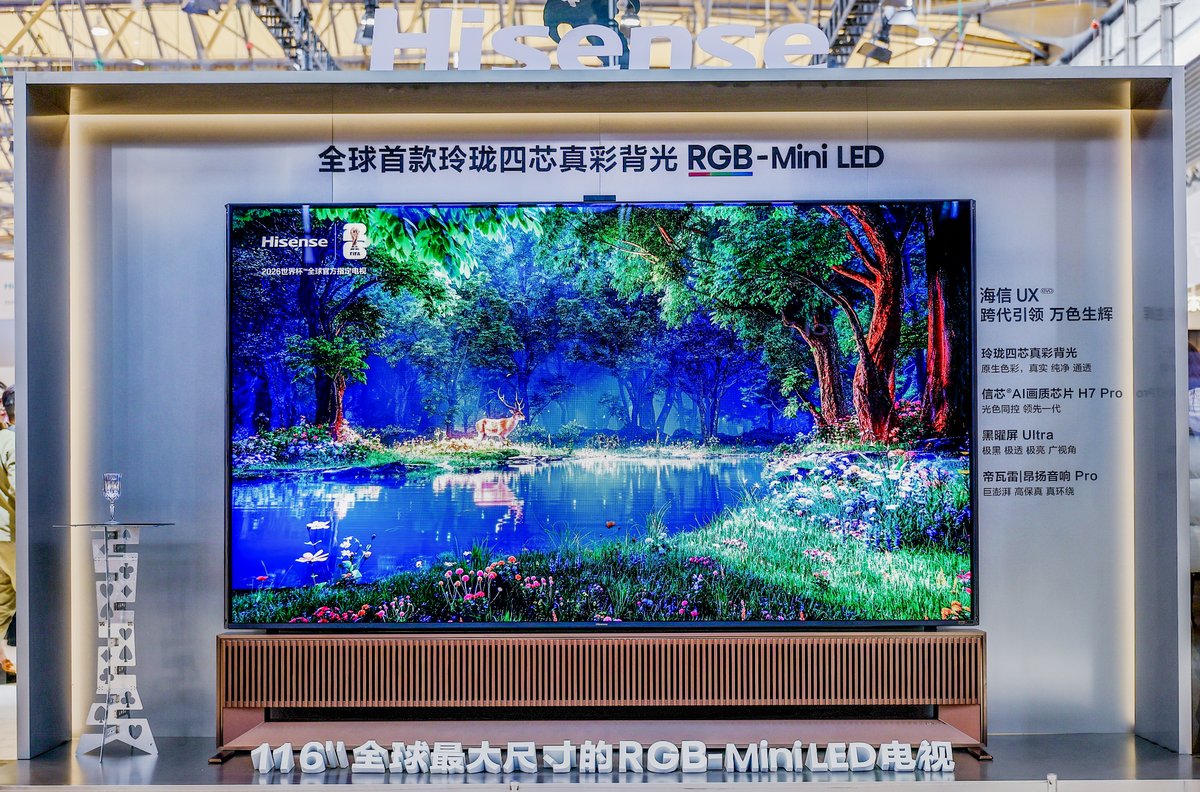 特别是116UX2026款,作为全球最大的 RGB-Mini LED 电视,带来了“犯规级”的画质暴击。春日花海的层次渐变、海底珊瑚的斑斓肌理、非遗掐丝珐琅的温润质感,逼真到仿佛身临其境。影游旗舰E8S Pro则现场打造了沉浸式体验区,体验者可以秒切专属《黑神话》《影之刃零》游戏模式,搭配4K 180Hz原生高刷与FreeSync Premium PRO技术,运行游戏无拖影、无撕裂,操作直接起飞。世界杯观赛区则是体育迷的“乐土”,百吋大屏除了带来如临现场的沉浸感,其内置AI体育智能体,可实时识别球星、拆解战术等,是最好的“看球搭子”。