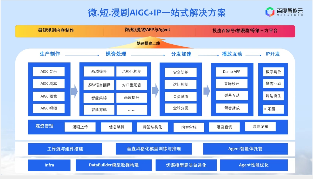百度智能云此次发布的AI漫剧行业解决方案,聚焦“从创意到成片”的全链路能力整合,覆盖剧本生成、分镜拆解、角色与场景设定、画面生成、动态演绎、配音配乐及内容管理等核心环节。通过模型能力与行业工具链的结合,原本高度依赖人工分工的制作流程正在被拆解和重组,使创作团队能够以更轻量的方式完成高频内容生产。